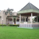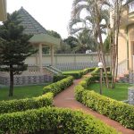 - À gauche : allée menant à la paillote en tuiles, à l’entrée principale et à la vaste pelouse verdoyante